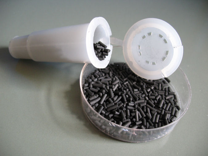 Der Stopfen kann mit dem Schnappdeckel immer wieder mit ca. 3 g Aktivkohle gefüllt werden. Die Aktivkohle adsorbiert ca. 30% ihres Gewichts, d.h. ca. 0,6-0,9 g Schadstoff pro Stopfenfüllung. Die Kohle wird erneuert, wenn das Gewicht des Stopfens um ca. 0,6 g zugenommen hat oder wenn erste Geruchsbelästigungen auftreten.