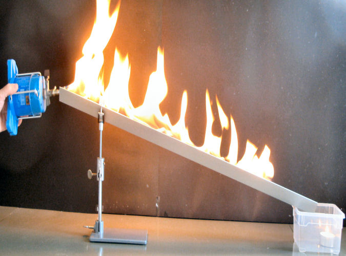 Diese Gefahr lässt sich besonders eindrucksvoll mit dem Demoversuchs-Set und einem Butanbrenner zeigen.Die Geschwindigkeit der herabfließenden Dämpfe kann mit der Anordnung einfach variiert werden. Die Dämpfe werden am Ende der Rinne in eine Wanne geleitet, in der eine Kerze aufgestellt wird. Dadurch fließen die Dämpfe beim Versuch nicht unkontrolliert vom Tisch.