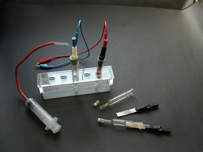 - Wasserstoffbezugselektrode anschaulich mit gasförmigem Wasserstoff, der vor den Versuchen in einer verschließbaren Kunststoffspritze ausgegeben wird.