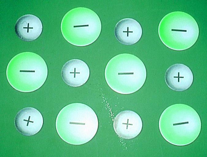 • Acht graue Kationen (DN 4,5cm) und acht grüne Anionen (DN 6cm) ermöglichen den dynamischen  Aufbau eines Ionenkristallgitter- Ausschnitts an der Tafel.