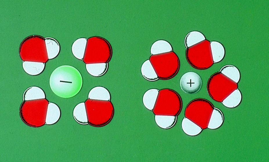 • Mit den 12 weiß-roten Wassermolekühlen (DN ca. 8,5cm) kann das Auflösen des Ionenkristalls schriftlich erarbeitet werden.