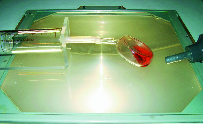 Für die ganze Klasse gut sichtbar, lassen sich die Vorgänge beim Sieden und Kondensieren beobachten. Dazu werden leichtflüchtige Substanzen wie Diethylether, Methylenchlorid oder Pentan in dem Projektionskolben mit einem Fön erwärmt. Am Kolbenprober lässt sich  die Volumenzunahme verfolgen. Außerdem kann damit der Einfluss von Druck bzw. Vakuum auf den Siedevorgang für alle gezeigt werden.