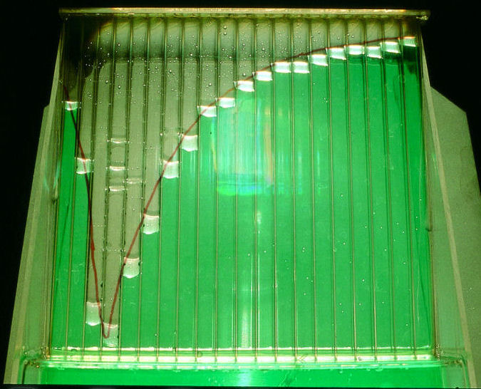 Experimente mit der Pneumatischen Röhrenwanne zeigen Änderungen der Reaktionsgeschwindigkeit während des Ablaufs einer Reaktion. Man misst dabei die innerhalb bestimmter Zeitintervalle gebildeten Portionen eines gasförmigen Reaktionsprodukts. Das Gas wird dazu nacheinander in die 20 Röhren einer Pneumatischen Wanne eingeleitet. Im Ergebnis ergibt sich ein Volumen-Zeit-Diagramm, aus dem die Definition der Reaktionsgeschwindigkeit abgeleitet werden kann. Mit dem Versuch kann auch die Abhängigkeit der Reaktionsgeschwindigkeit von der Konzentration und der Temperatur der Ausgangsstoffe gezeigt werden. Da der Versuch für die Demonstration auf dem OH-Projektor konzipiert wurde, können alle Abläufe von der ganzen Klasse gut beobachtet werden.