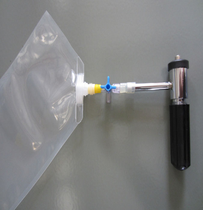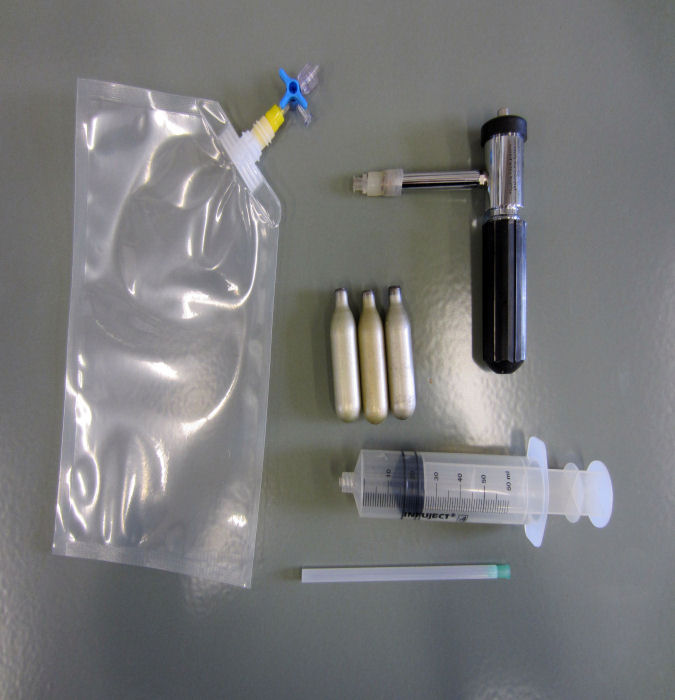 Mit dem handlichen Gasdosiergerät können aus einer Druckkapsel mit 8 g CO2 sehr bequem bis zu 4,5 Liter in den 500 ml-Gasbeutel gefüllt und für Schülerversuche ausgegeben werden.