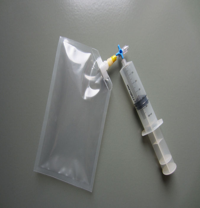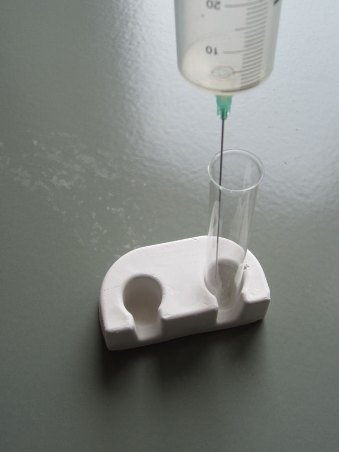 Aus den Gasbeuteln mit MedTech-Dreiwegehahn können dann die Schüler das Gas auf einfache Weise mit der 50 ml-Kunststoffspritze entnehmen und mit der langen Kanüle für die Untersuchungen (z.B. negative Glimmspanprobe oder Nachweis mit Kalkwasser) in Reagenzgläser füllen.